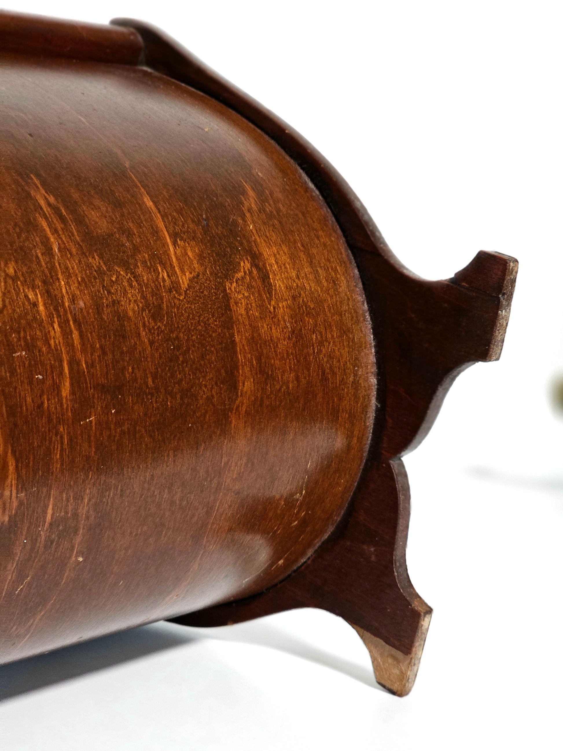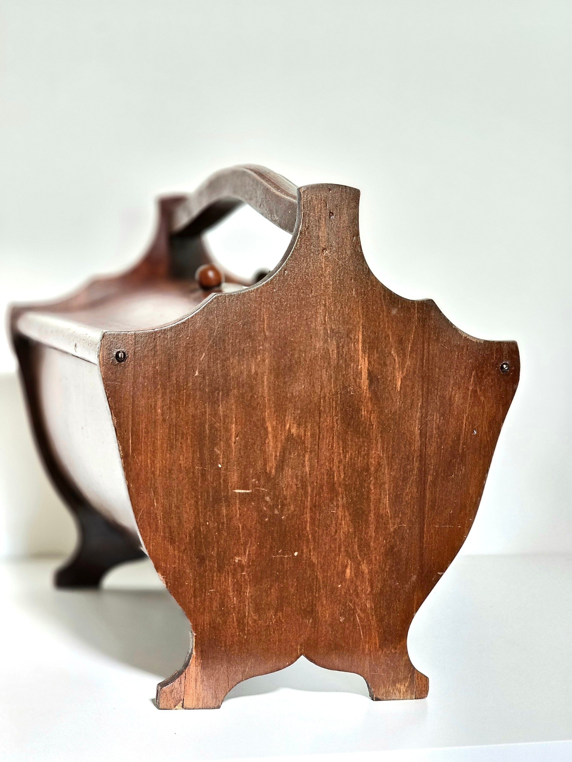 Ooh, this little cutie is made of real wood and has a pretty dark stain! The bottom is so cool – it's bentwood, made from one piece of wood that was bent with steam! Inside, there's one big space with a little shelf on the side. Both doors open smoothly! It's in great vintage condition, it has a few little marks here and there, shown in pictures.