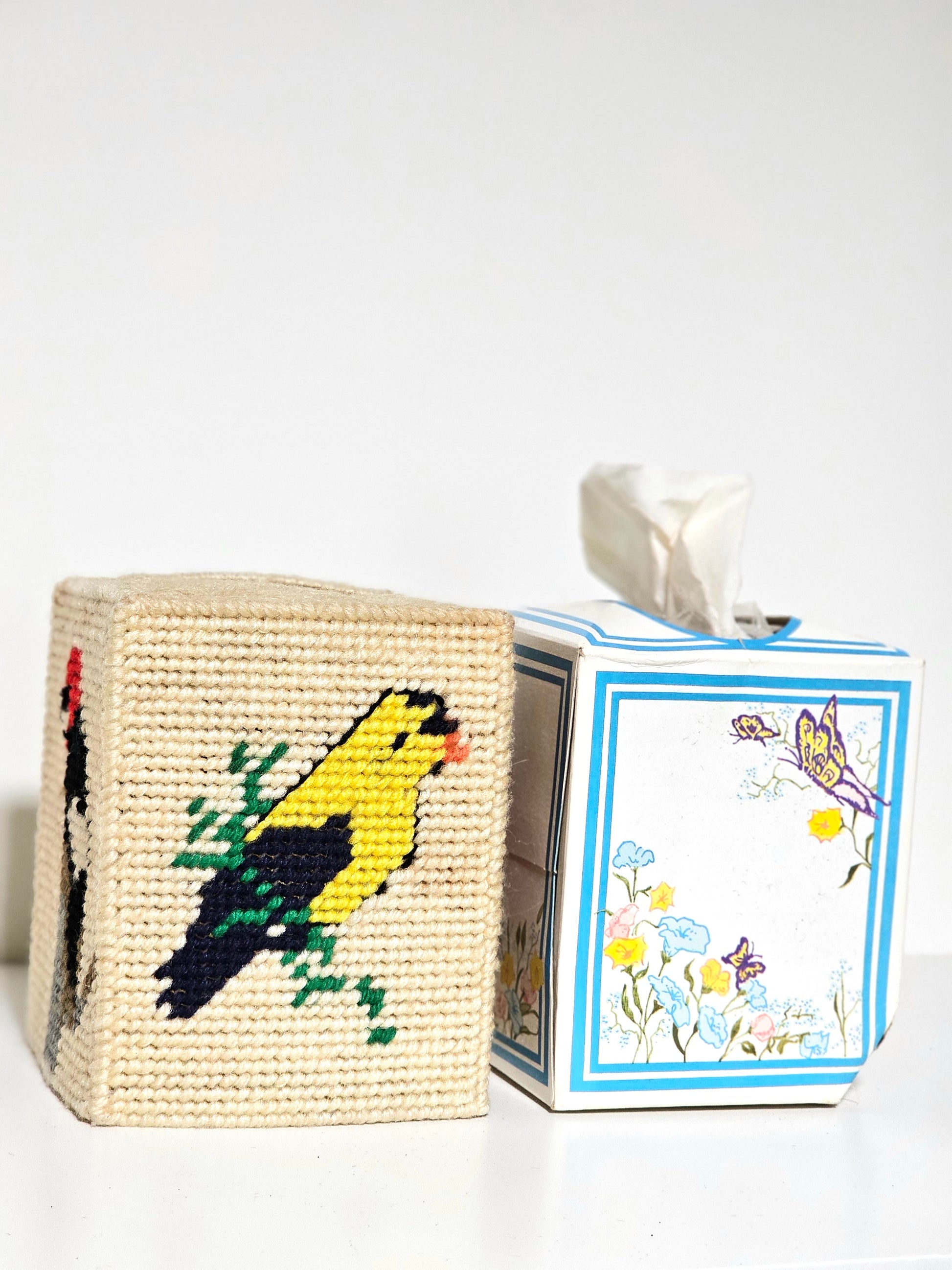 Add some vintage whimsy to your tissue game with this 1981 Needlepoint Tissue Box featuring four different bird designs. A labor of love, no doubt. Some stitching is missing on the cardinal, but that only adds to the charm. She really adds a touch of nostalgia and quirkiness to your home decor!