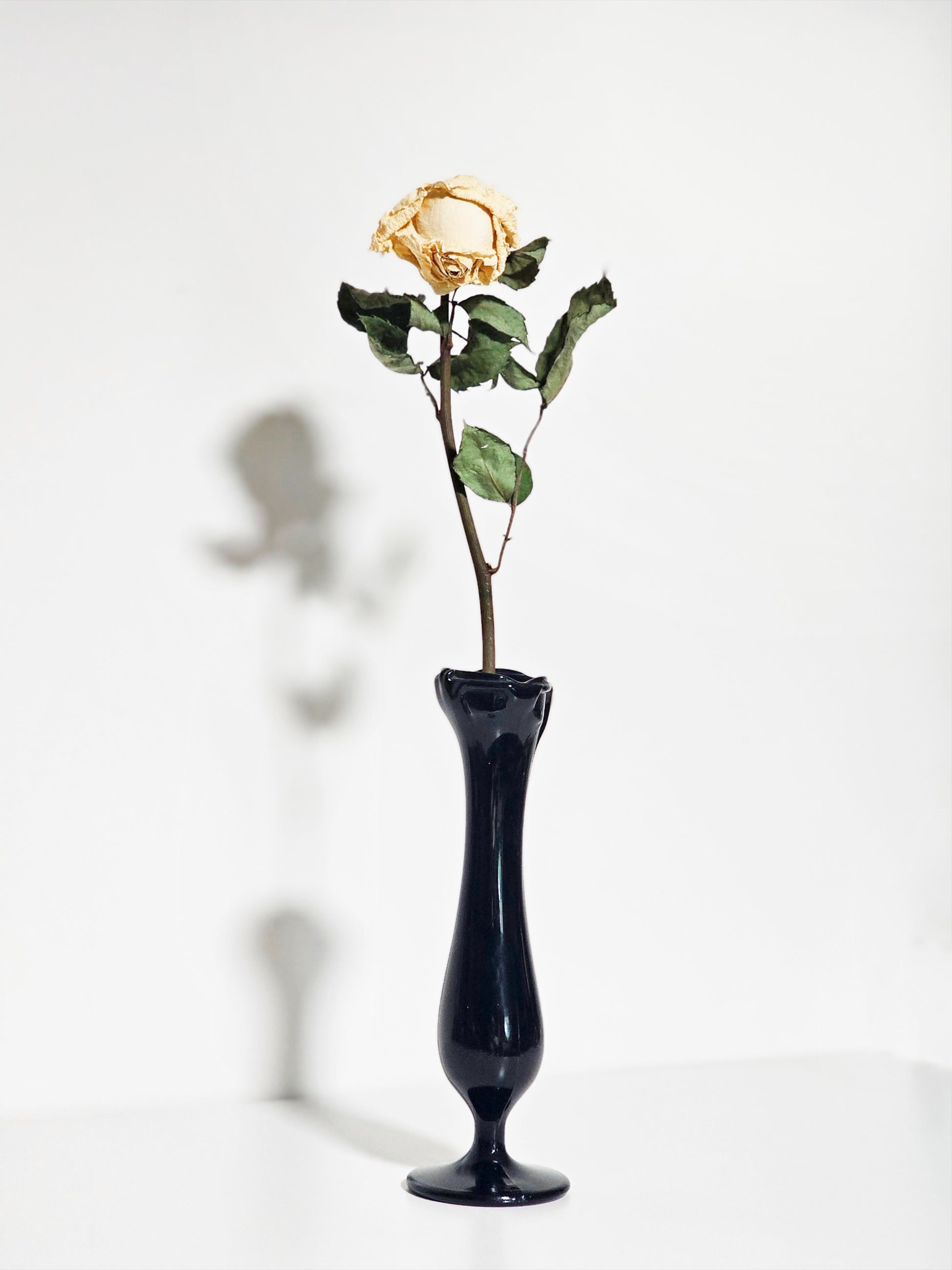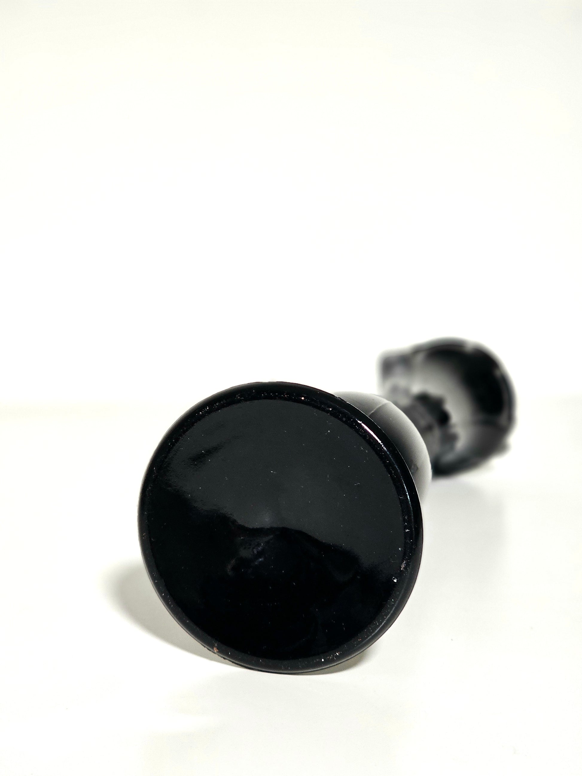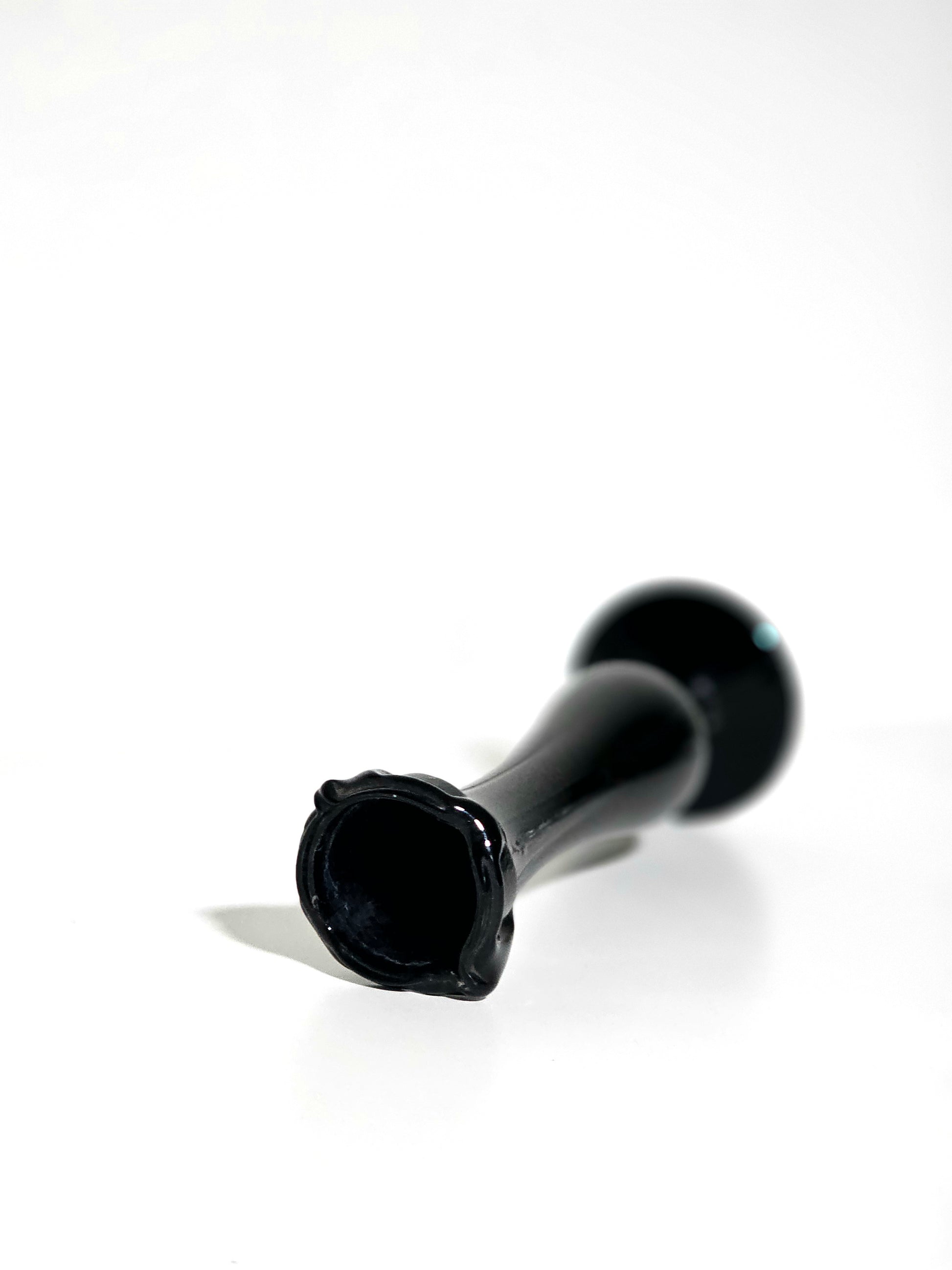 A beautiful piece of luxury style, this amethyst glass bud vase is a stunning little reminder that simple and small can be fully impactful. Sporting a sleek black look, she's actually a deep, deep purple glass! The method of making these glass pieces is unique in itself - its a "swung" vase. Upon firing the glass, the glassmakers will hold the vase by the opening on top and swing it back and forth for that organic drop curve.