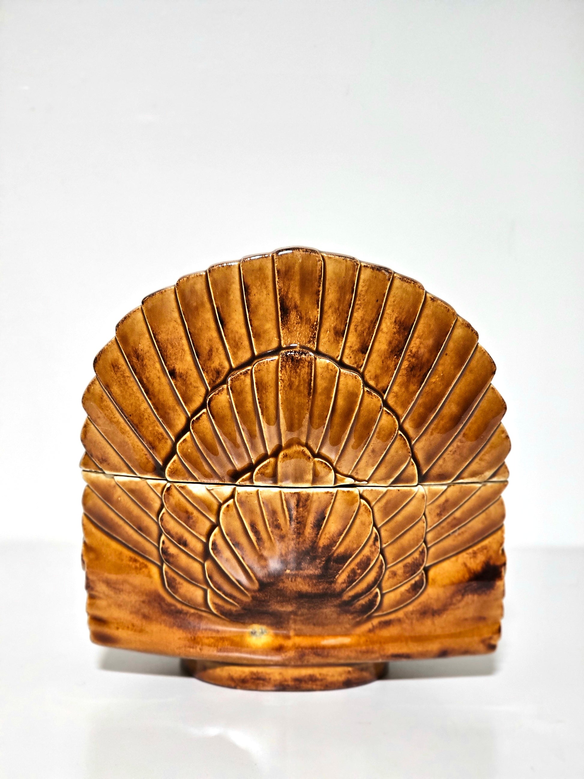 This turkey is the main character! With his dynamic glaze and many-feathered bulbous body, he is sure to bring a smile to your face. Wonderful for Thanksgiving, or for a farmhouse vibe. Hand-painted with an etched signature on the bottom.