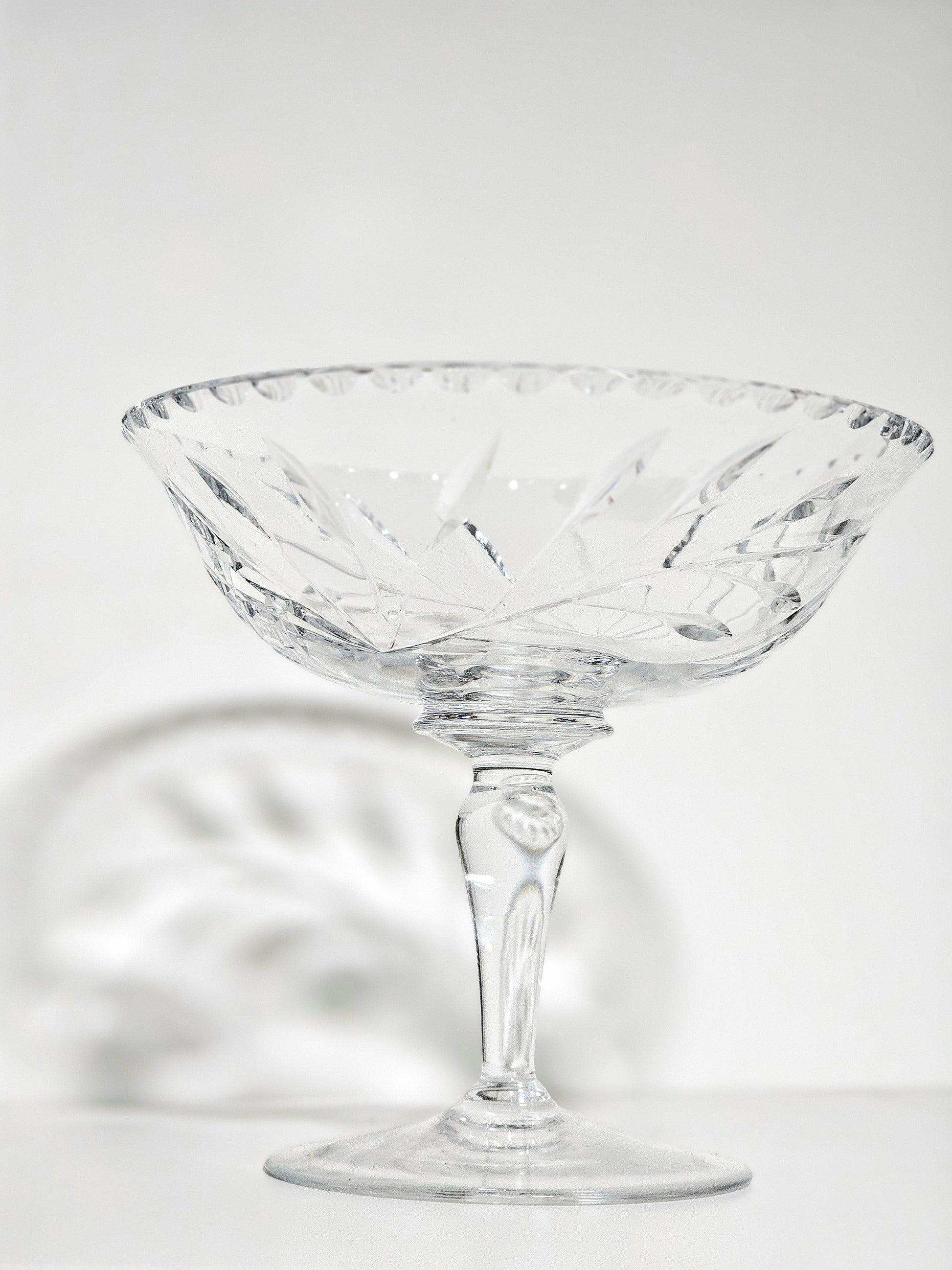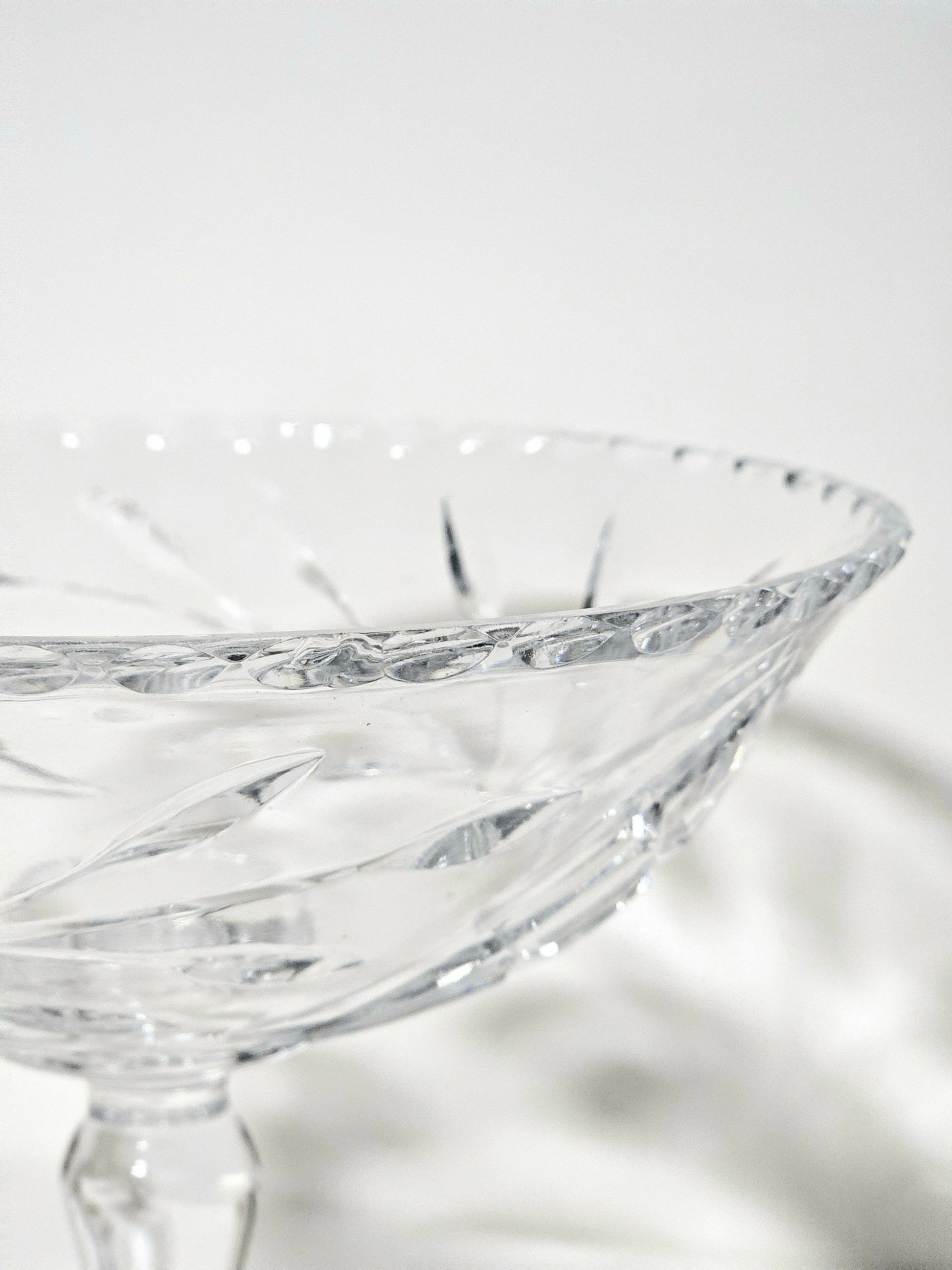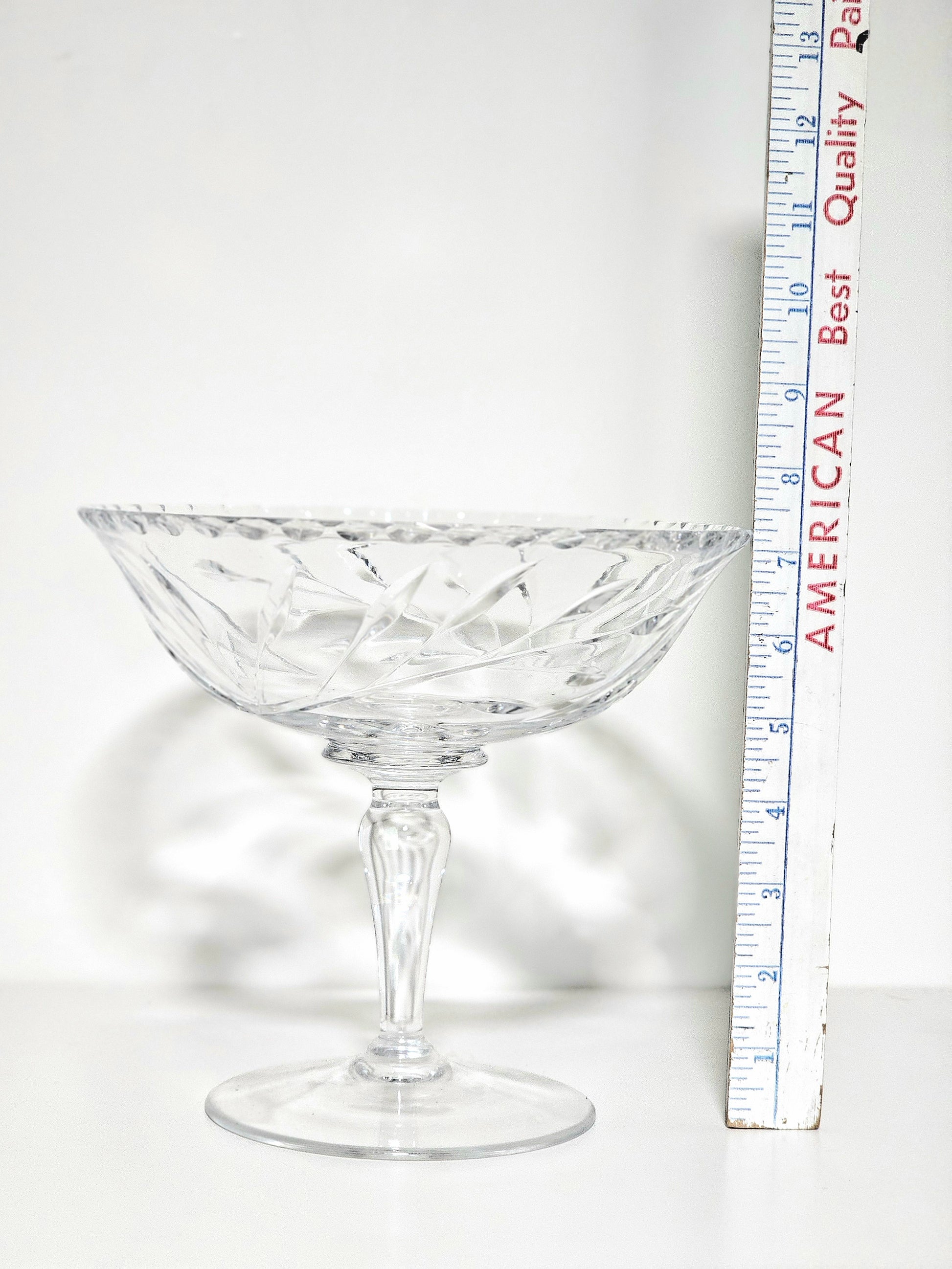 The elegant possibilities are endless with this wonderfully crafted crystal compote. With the familiar beautiful ring when flicked, you know this compote is here to impress. Encapsulated rainbows pair wonderfully with the sturdy base and delicate cut-style leaves surrounding her cup. A little over 7" tall, with a diameter of 8".