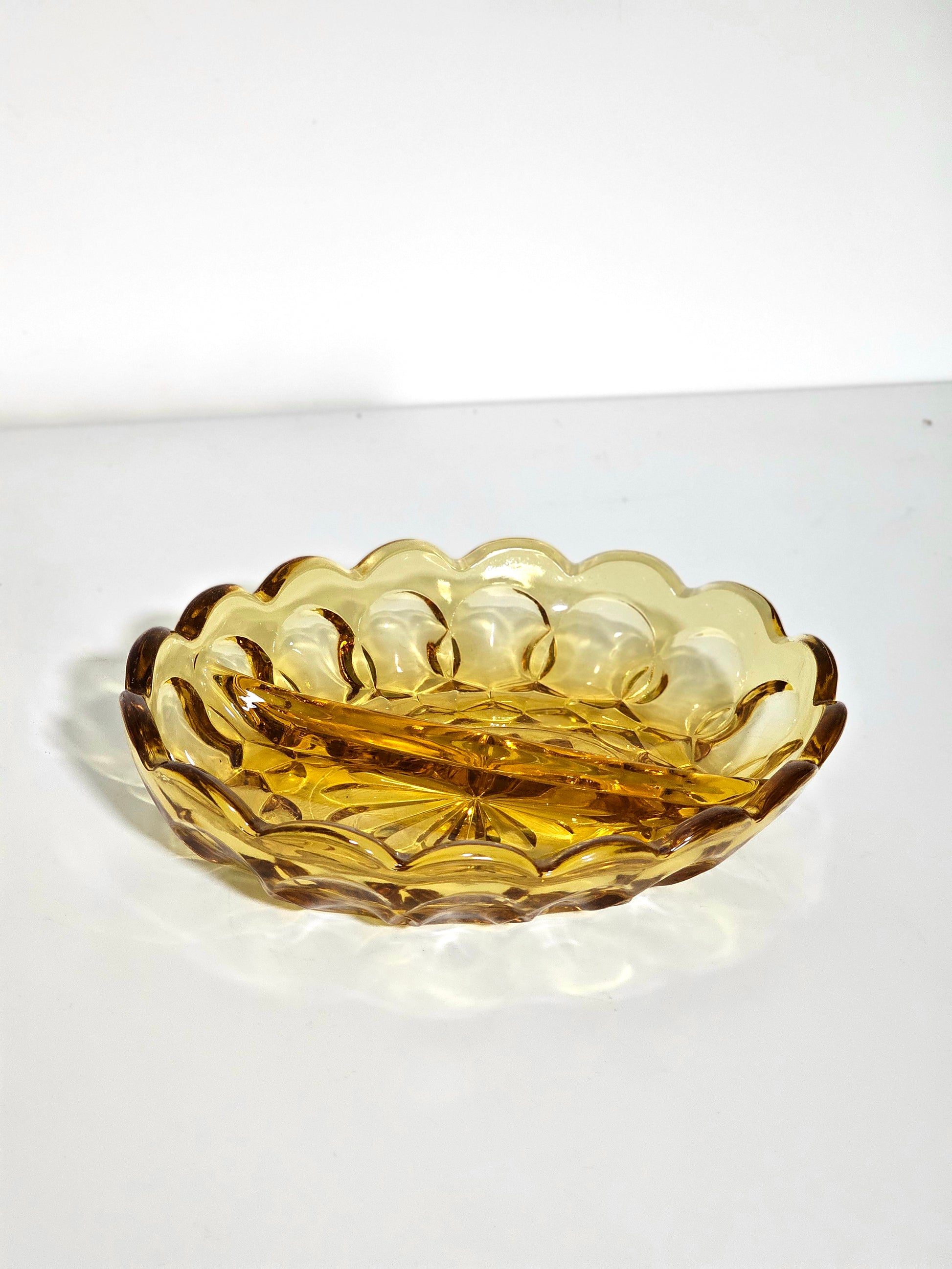 An incredibly dynamic piece of beautiful amber glass made by Anchor Hocking in the 1970s. This is a relish dish, but can be used for any divided dish needs. Relish dishes were originally for things like charcuterie, and I can only imagine how brilliantly this piece of glassware could elevate a spread.