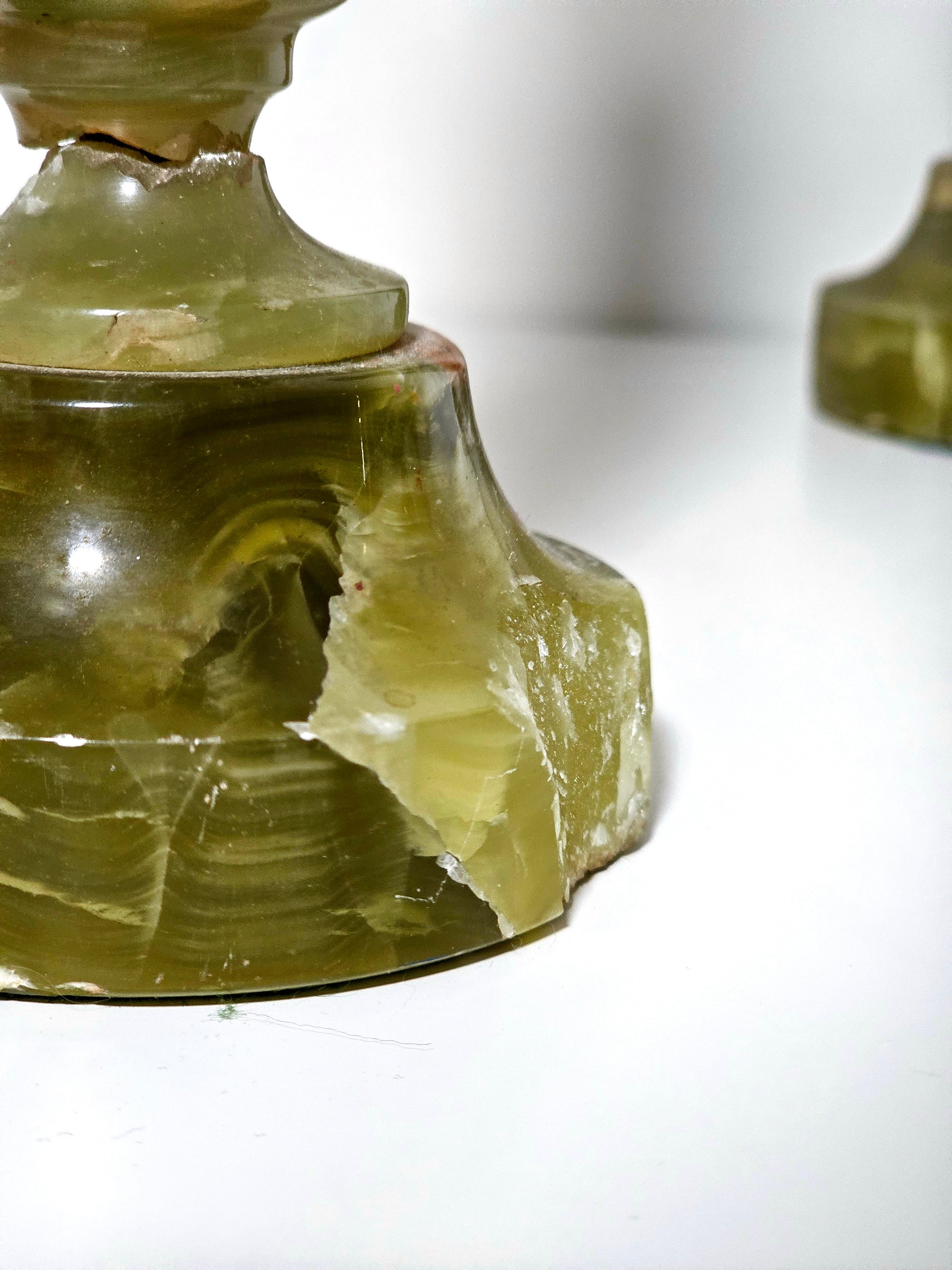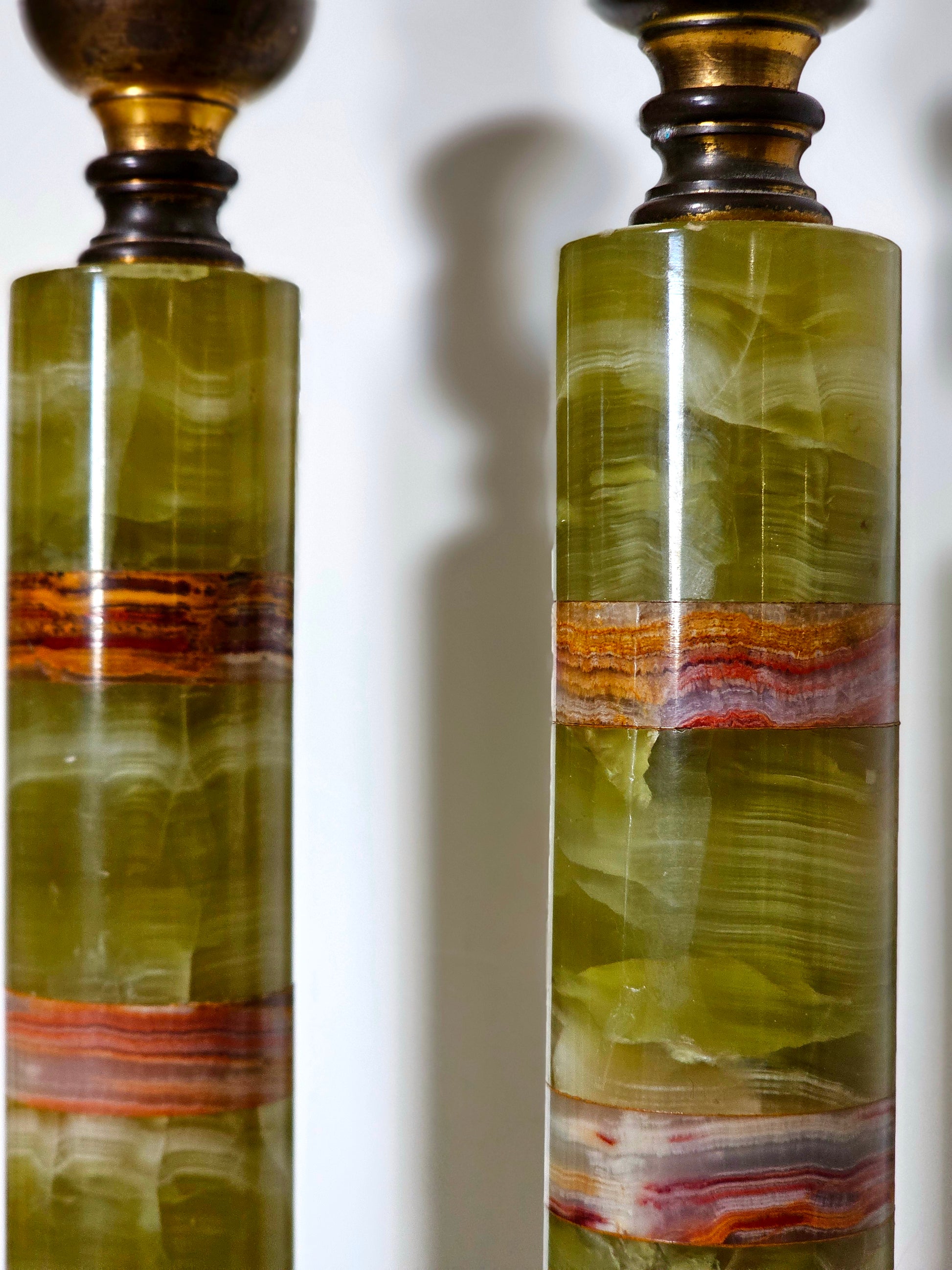 An elegant & rare pair of handmade carved natural stone candlesticks. The green onyx has incredible variations of moss and chartreuse, a beautiful beautiful stone. Stacked between the green is high-dynamic brown marble alluding to the beauty of wood. Like wrapping in a bow, it is completed with brass tops.