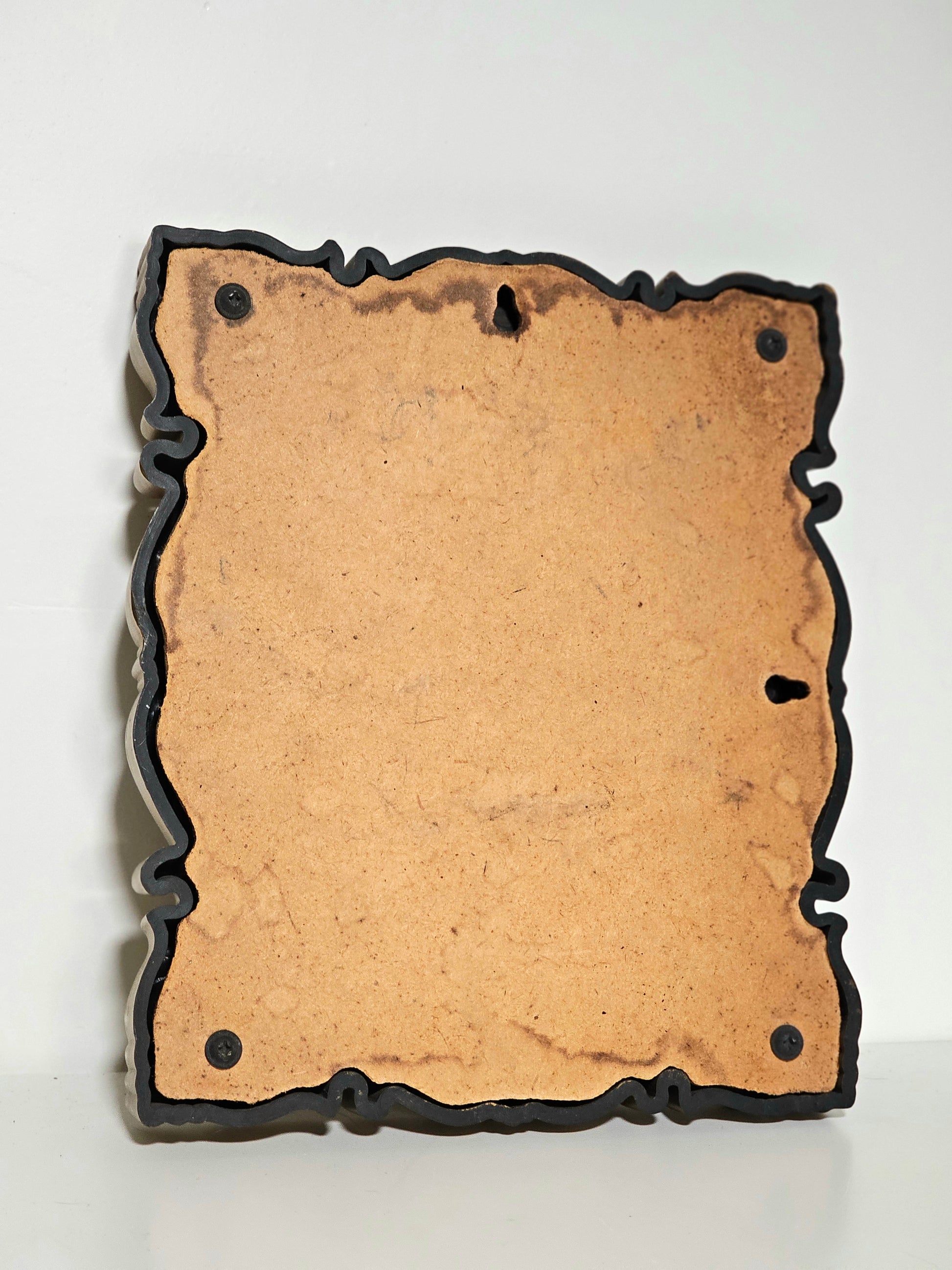 This mirror is made Homco-style resin, very durable. It's got inlaid scrolling and an ornate design. It does have one small scuff, and it's more apparent in the pictures than in person.