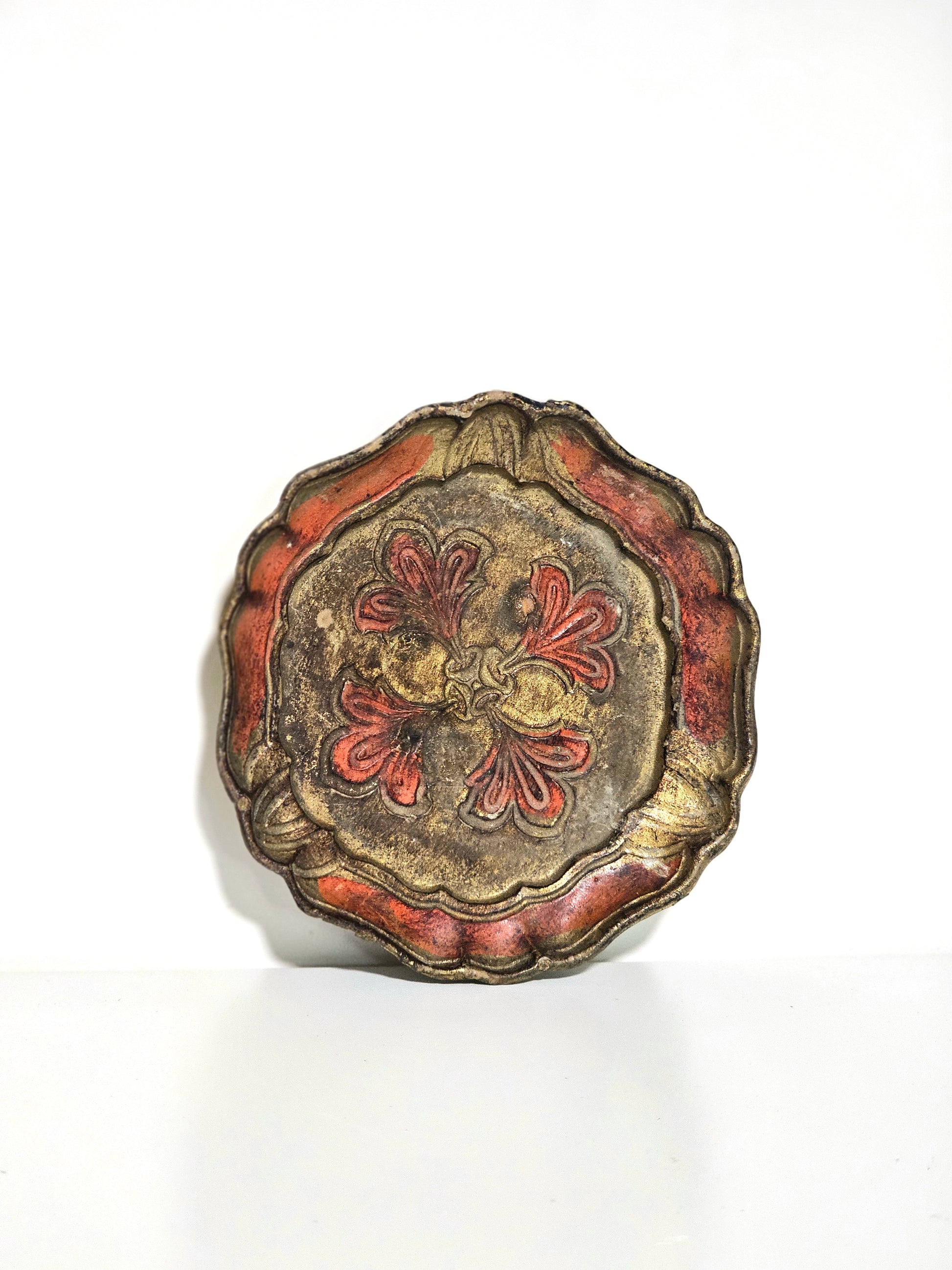 This Italian Florentine coaster is a beautiful little accent gem with a scalloped edge and gold gilt wood. It has an ornate orange-warm decorative relief in the middle featuring stylized acanthus leaves, characteristc of Renissance Florentine anesthetics! About 4" in diameter