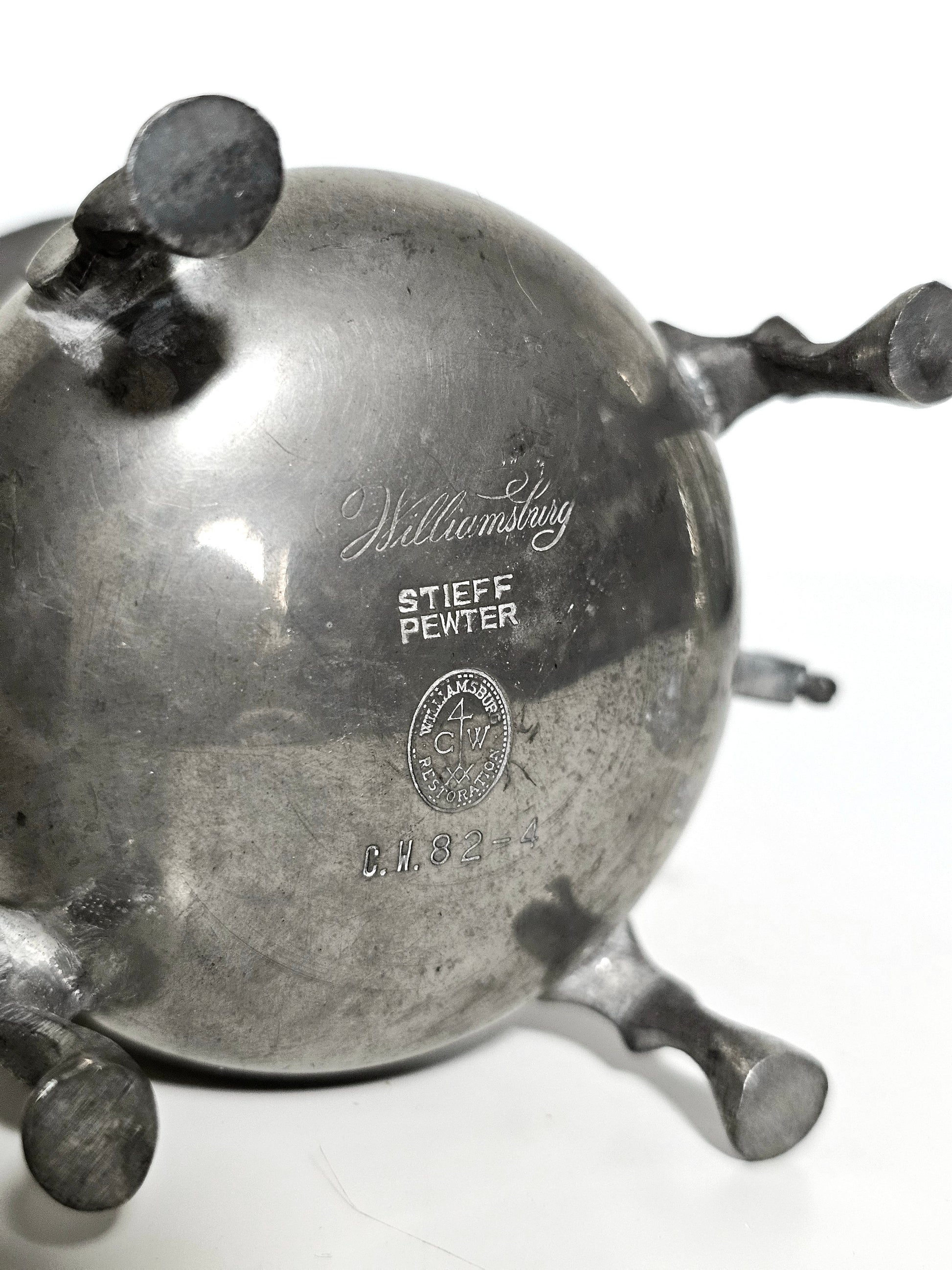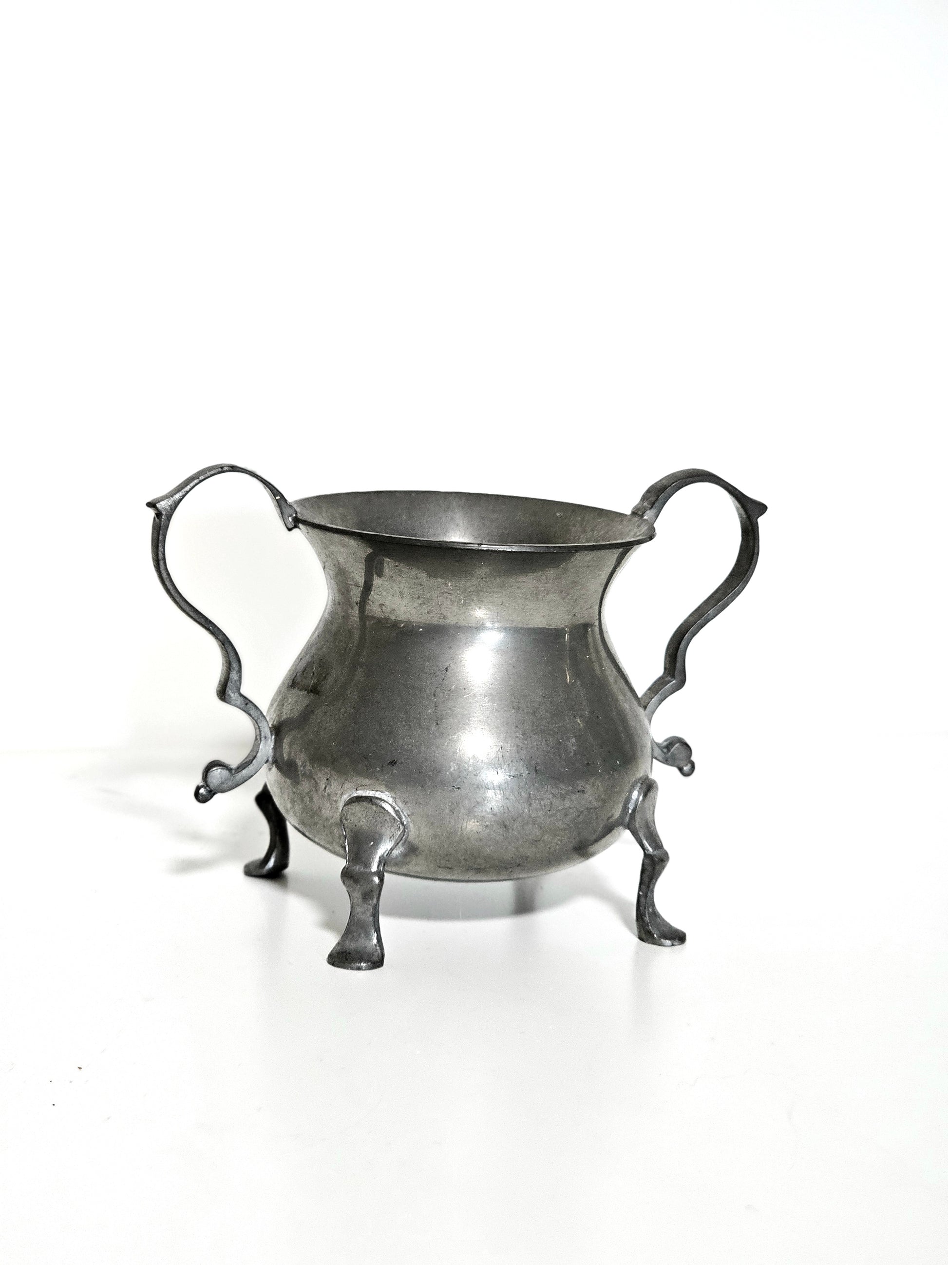 A quadruple-footed pewter relic with high arched handles, alluding to its age and history. In the 1960's Williamsburg paired with Steiff to create reproductions of 18th century design tableware. This particular one is in the CW 84-7 design, from Colonial Williamsburg, 1700s.